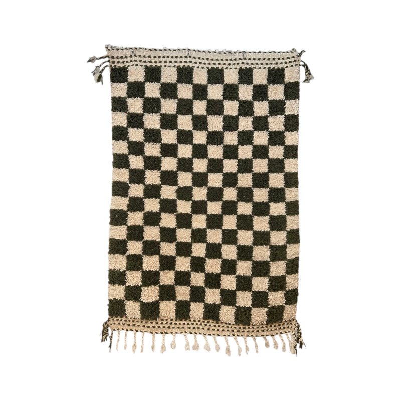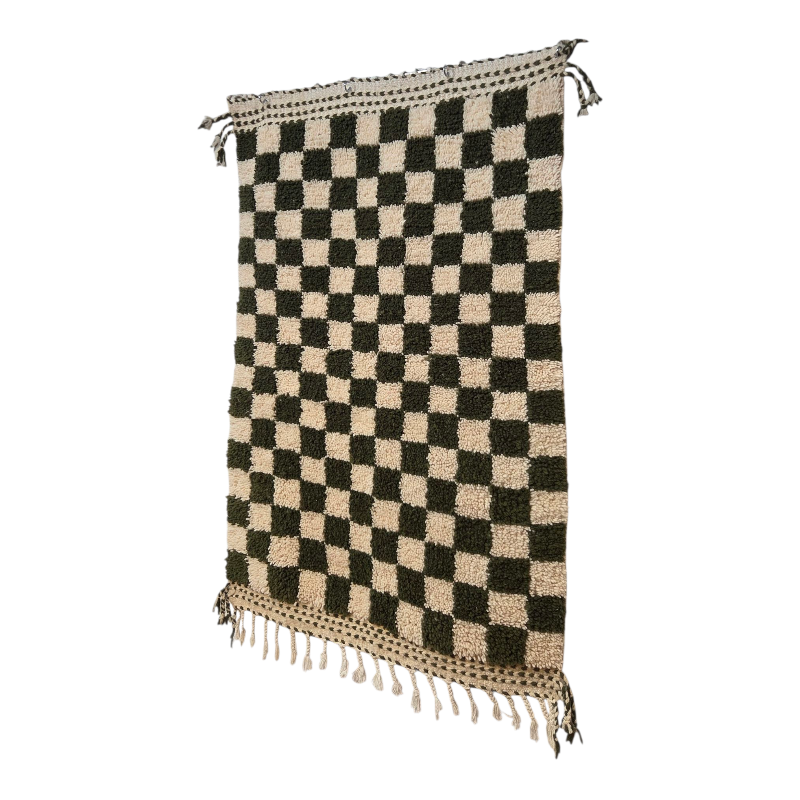 Le tapis Beni Ouarain est sans doute le plus connu des tapis berbères, originaire des régions montagneuses du Moyen-Atlas au Maroc par les tribus Aït Ouaraïn.Il est aujourd’hui très prisé pour le style épuré et minimaliste qu’il offre et par son esthétique et le confort qu’il procure. Tissés à la main dans une laine naturelle douce et épaisse, ils se distinguent par leurs grandes tailles, des motifs géométriques en forme de losange et un style minimaliste.Réalisé artisanalement sur un métier à tisser, ce qui demande un temps de confection très long qui peut aller de plusieurs jours à plusieurs mois en fonction de sa taille.
