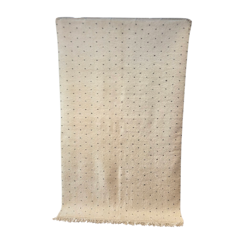 Le tapis Beni Ouarain est sans doute le plus connu des tapis berbères, originaire des régions montagneuses du Moyen-Atlas au Maroc par les tribus Aït Ouaraïn.Il est aujourd’hui très prisé pour le style épuré et minimaliste qu’il offre et par son esthétique et le confort qu’il procure. Tissés à la main dans une laine naturelle douce et épaisse, ils se distinguent par leurs grandes tailles, des motifs géométriques en forme de losange et un style minimaliste.Réalisé artisanalement sur un métier à tisser, ce qui demande un temps de confection très long qui peut aller de plusieurs jours à plusieurs mois en fonction de sa taille.
