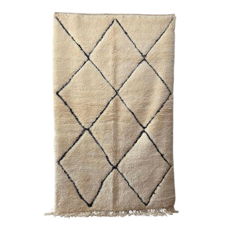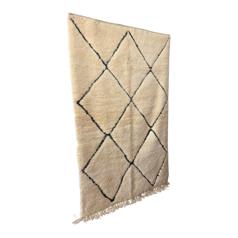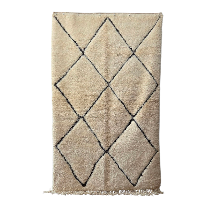 Le tapis Beni Ouarain est sans doute le plus connu des tapis berbères, originaire des régions montagneuses du Moyen-Atlas au Maroc par les tribus Aït Ouaraïn.Il est aujourd’hui très prisé pour le style épuré et minimaliste qu’il offre et par son esthétique et le confort qu’il procure. Tissés à la main dans une laine naturelle douce et épaisse, ils se distinguent par leurs grandes tailles, des motifs géométriques en forme de losange et un style minimaliste.Réalisé artisanalement sur un métier à tisser, ce qui demande un temps de confection très long qui peut aller de plusieurs jours à plusieurs mois en fonction de sa taille.
