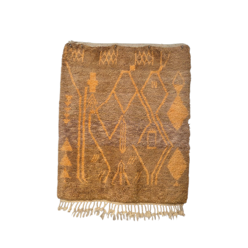 Le tapis Beni Ouarain est sans doute le plus connu des tapis berbères, originaire des régions montagneuses du Moyen-Atlas au Maroc par les tribus Aït Ouaraïn.Il est aujourd’hui très prisé pour le style épuré et minimaliste qu’il offre et par son esthétique et le confort qu’il procure. Tissés à la main dans une laine naturelle douce et épaisse, ils se distinguent par leurs grandes tailles, des motifs géométriques en forme de losange et un style minimaliste.Réalisé artisanalement sur un métier à tisser, ce qui demande un temps de confection très long qui peut aller de plusieurs jours à plusieurs mois en fonction de sa taille.