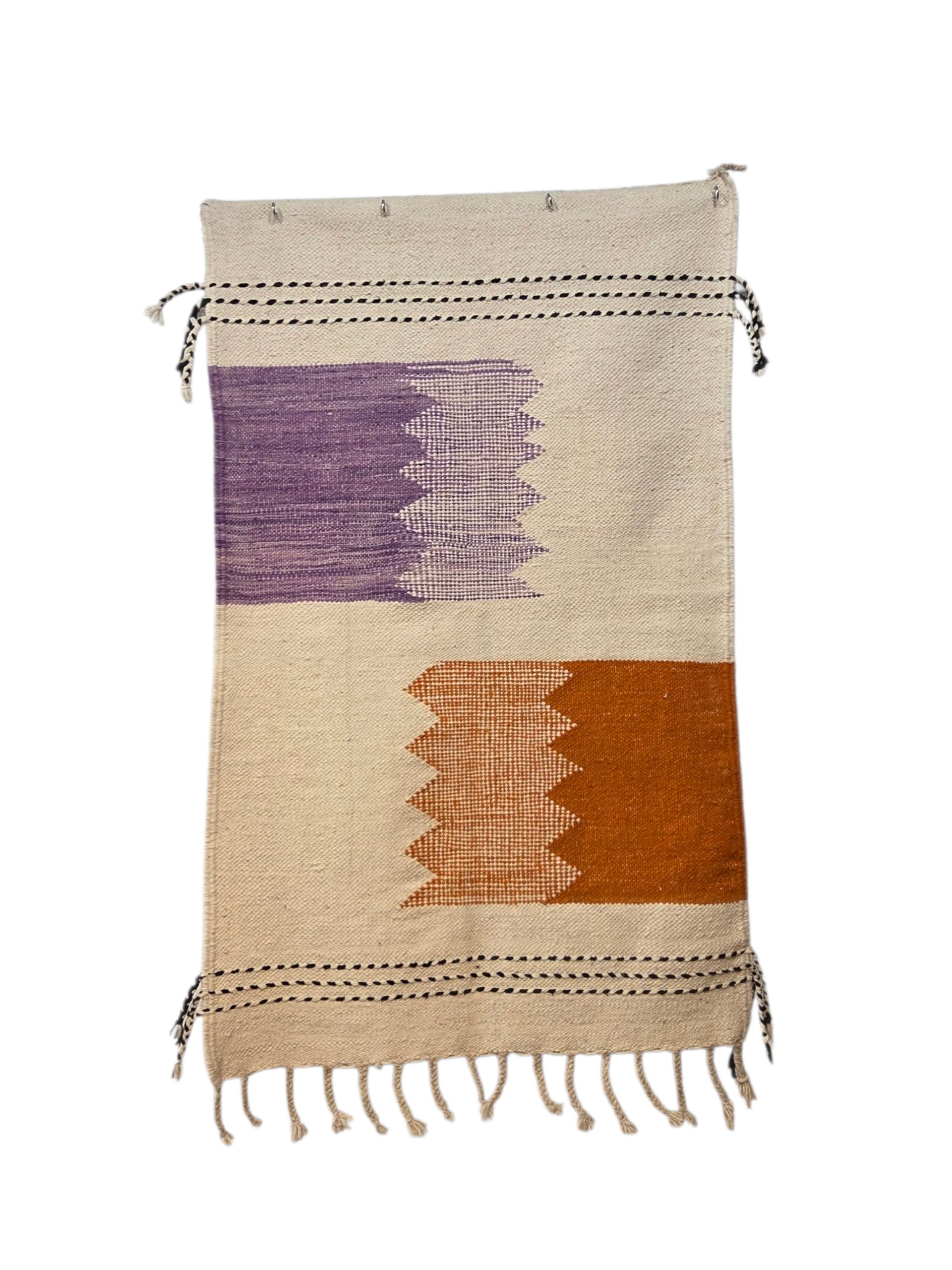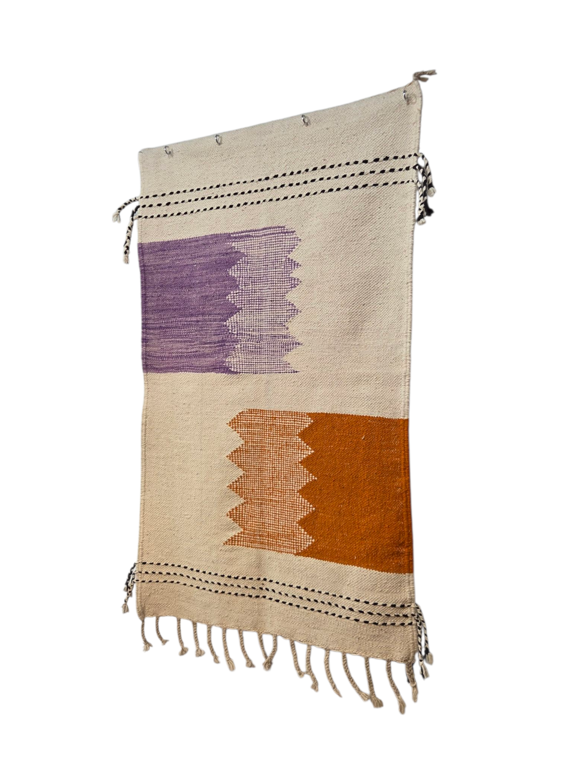 Ces tapis berbères tissés à la main 100% en laine, reprennent les dessins et graphismes des célèbres tapis Beni Ouarain, mais avec un tissage spécifique qui se rapproche de celui des tapis Kilim.